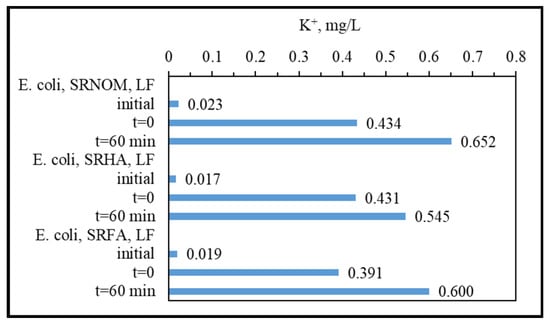 Release of cellular components upon the SPCI of E. coli in the presence of NOM representatives was assessed in terms of protein, K+, and dissolved organic carbon (DOC) contents according to the methodology presented previously by Birben et al. []. A Shimadzu Vwp TOC analyzer was used for the determination of the DOC content (mg/L) in non-purgeable organic carbon mode. The Lowry method was used to elucidate the total protein content of the sample solutions. The total K⁺ content was determined based on the methodology given in standard methods of the 3500-K B flame photometric method. Detailed explanations of the DOC measurement, the Lowry method, and determination of the K+ content were all presented by Birben et al. previously [].