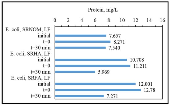 As for NOM compounds, charge development on NOM sub-fractions was also pH dependent with reference to the presence of carboxylic (pH 3–5) and phenolic (pH > 8) groups []. The number of carboxyl groups was indicated in decreasing order as SRFA > SRNOM > SRHA and the number of phenolic groups as SRHA > SRNOM > SRFA (Table S2). The LF surface charge dominated at pHzpc = 8.9, since the solution pH was 6–7, this value being lower than pHzpc at which the LF surface is mostly positively charged. Therefore, electrostatic attractions could be expected between E. coli, organics, and the LF surface. Since E. coli is considerably larger in size (E. coli length = 1–2 μm and diameter = 0.5–1 μm), both organic sub-fractions and LF would be directed to the cells. Scanning electron microscopy (SEM) images of the aggregate size clusters of LF were reported as 40–70 nm, whereas X-ray diffraction (XRD) measurements revealed a crystallite size of 43 nm [].
