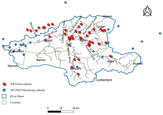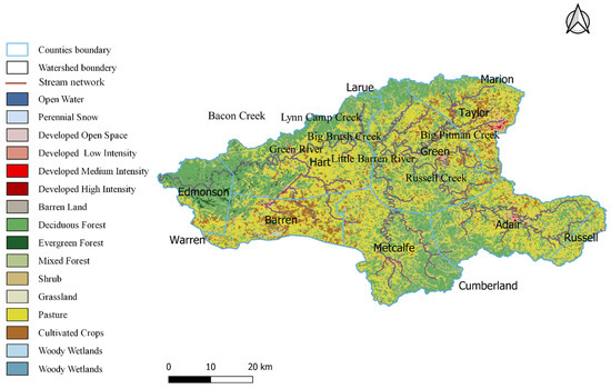 The watershed under study is situated in the lower southwestern part of Kentucky in the USA. The watershed is called the Upper Green River watershed as the main stem of Green River, and its tributaries flow through it. The watershed consists of Russell, Adair, Taylor, Metcalfe, Green, Barren, Hart, and Edmonson counties. Although the watershed contains various land uses such as deciduous, evergreen, mixed forest, transitional, low and high intensity residential, commercial, industrial/transportation, open water, pasture or hay, emergent herbaceous wetlands, row crops, woody wetlands, they can be primarily grouped into three types of land using: urban, forest, and agricultural. The Green River flows through Edmonson, Hart, Green, and Taylor counties and joins the Ohio river downstream of the watershed. Extensive underground karst formations and springs exist between the tributaries of the main stem Green River. The watershed primarily consists of flat-lying limestones, sandstones, and shales forming the karst topography that passes all the surface water through caves and smaller underground passages below the ground surface [28]. The watershed is rated as the fourth most crucial watershed in the United States by the Nature Conservancy and the Natural Heritage Program. It is also the most critical watershed in Kentucky to protect fish and mussel species.