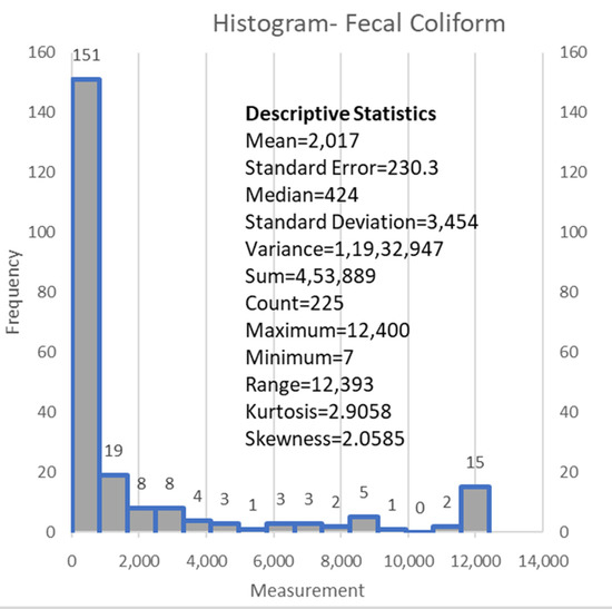 The agriculture land-use factor (ALUF or a) is highly and negatively correlated with the forest land use factor (FLUF or f). FLUF also has a strong negative correlation with urban land use factor (ULUF or u). An exciting inference from the correlation heatmap is the heavy positive correlation between precipitation and fecal coliform (please see Figure 4). A few scatter plots that reveal the relation between the input variables and the fecal coliform individually essentially display the results of the correlation map, i.e., Figure 4, and are not reproduced here. This makes precipitation the most significant variable in determining our output using the decision tree method, and this is evident from the CART and ID3 diagrams given a little later. The precipitation values are obtained at each sampling locations by interpolating the two-day cumulative precipitations at all the gauges in the watershed. The rainfall causes the surface water flow over the watershed’s overland planes consisting of land uses (predominantly urban, forest, and agricultural) and eventually joining the tributaries and mainstem of the Green River. The various parts of the overland planes of the watershed contribute as surface water flows, which enters tributaries first and then the main stem of Green River before reaching the watershed outlet tip. Based on watershed characteristics and time of concentration studies, the two-day cumulative and interpolated precipitation values are most suitable drivers of fecal coliform concentrations than other precipitation measures at all the sampling sites [29]. The positive correlation of microbial indicators such as fecal coliform bacteria and precipitation/rainfall/wet weather conditions is in agreement with the other studies such as that of [40,41,42,43,44] for rivers and bays and [45,46] for lakes. The DTs are best suited for large datasets; however, an attempt is made in the current study because of the multi-dimensional feature space (five independent variables) for monthly instances of data of forty-two locations collected for the six-month period. The DTs are expected to work better for shorter data sets and fewer features as the intrinsic data complexities are reduced. In the present scenario, data limitations on the time frame are offset by the multi-dimensional feature space for varied spatial locations. The reduction of input dimension has been looked into for the same dataset using principal component analysis (PCA), canonical correlation analysis (CCA), and artificial neural networks (ANNs) elsewhere [47]. The authors have found comprehensive predictions using all the spatial parameters such as land uses, and temporal climate parameters. The histogram of fecal coliform is given in Figure 5. The variability of fecal coliform is large as is evident from the high standard deviation and the histogram.