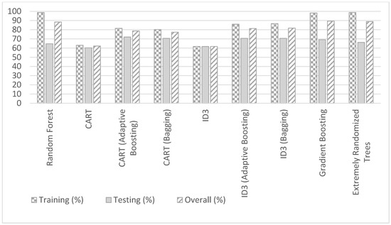 Where ID3-Bagg is ID3 with Bagging, and ID3-AB is ID3 with adaptive boosting. The extremely randomized trees (also known as “Extra Trees”) give a fourth-best testing accuracy of 66.17% and a second-best overall accuracy of 88.89% of all the models. While the Random Forest model uses subsamples with replacement, the extremely randomized trees use the whole input sample. Also, while Random Forest opts for optimum split to select cut points, the extremely randomized trees go for random cut points. The extremely randomized trees are faster and have both features of reducing bias and variance due to usage of original input sample and random split points [49]. Gradient boosting model (GBM) gives third-best testing accuracy of 69.12% and best overall accuracy of 89.33% of all the models. In the Gradient Boosting model, a loss function such as mean square error is minimized with the help of gradient descent principle and an ensemble of weak learners to eventually make correct predictions and become a strong learner tree [50]. The GBM, ERT, and RF perform better than simple and ensemble models of CART, and ID3 in training, and overall accuracies; the ensemble models of CART, and ID3 are slightly better in testing accuracies. This could also be due to possible overtraining of the Decision Tree models in the case of GBM, ERT, and RF. Further, optimal cutting down of trees may result in higher Training, Testing, and Overall accuracies of GBM, ERT, and RF than simple and ensemble models of CART, and ID3. The accuracy of a decision tree model is given by the number of correct predictions made divided by the total number of predictions. Here, the prediction is the class to which the water sample belongs. These results are presented in Figure 6.