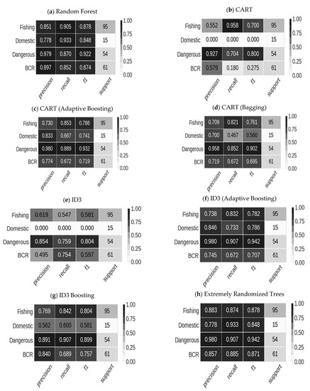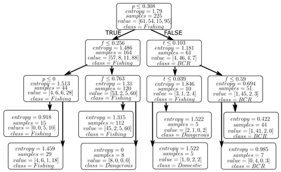 Again, since “p” is the most significant variable, the root node is split using the “Precipitation” input variable. The decision nodes in level 3 and level 4 are split to maintain lower Information Gain and Entropy uncertainty. Level 4 of the ID3 decision tree has the dataset classified into four pre-defined classes. Similar to the CART algorithm results, the class with the highest number of samples is “Fishing” followed by “BCR,” “Dangerous” and “Domestic.” The accuracies obtained for the training data set and overall dataset are 61.78% and 61.77% respectively, which is slightly lower than that obtained by the CART algorithm. From Table 2, we can see that ID3 with adaptive boosting comparable results to that of CART with adaptive boosting. Adaboost is an iterative procedure with no replacement. It generates a strong ensemble classifier by putting high weights on the mis-classifiers and low weights on the correctly classified trees to reduce bias and variance in the model. For this reason, it is called the “best out-of-the-box classifier” usually. The second-best testing accuracy is obtained using this method with ID3 in all attempted decision tree models. ID3 with bagging results can also be seen from Table 2, which creates many independent bootstrap aggregation models and associates weak learner with each model to finally aggregate them to produce average or ensemble prediction that has a lower variance. This method also yields the second best testing accuracy of all the decision tree models. We can see that the bagging and boosting ensemble methods improve the testing accuracy compared to simple ID3.