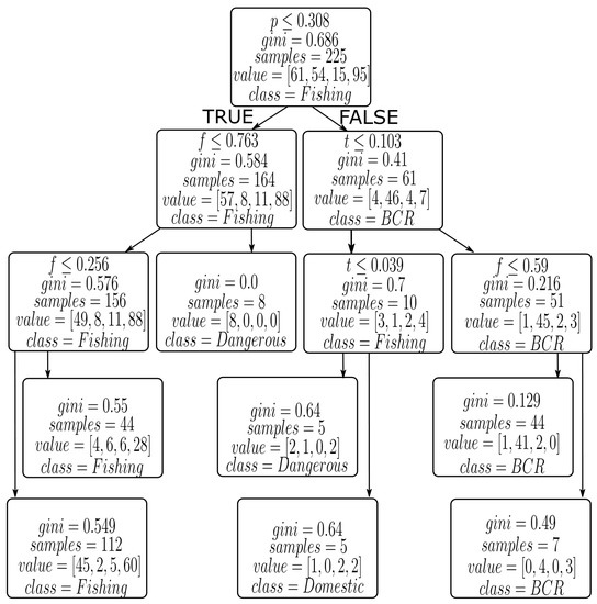 Level 1 has the root node. Level 2 and level 3 contain the decision nodes, and level 4 has the leaf nodes with data split into classes. The tree’s root node containing all 225 data points of our data set has been split based on the precipitation input variable (p) since p is the variable of the highest significance. The decision nodes at level 2 are split using the forest land use factor (f) and the temperature (t) input variables since these nodes represent points of highest Gini impurity. At level 3, we get our first leaf node of class “Dangerous” with eight samples falling in this category (p ≤ 0.308, f ≥ 0.763). The final level contains the leaf nodes that classify the data into the specified classes. The class with the highest number of samples is fishing (156 samples), followed by BCR (51 samples). The classes “Domestic” and “Dangerous” have 5 and 13 samples, respectively, giving us a total of 225 samples in our data set. The CART algorithm is a moderately accurate method to classify our data set, giving an accuracy of 63.05% on the training set and 62.22% on the entire data set. However, improving our model using bagging and boosting methods yield even higher accuracies. From Table 2, CART with adaptive boosting gives the best testing accuracy out of all the decision trees. The adaptive boosting method enables to combine several weak classifiers into a strong classifier through an iterative decision tree modeling. The weak classifiers are weighted highly and trained with a few low-weighted strong classifiers to produce a strong ensemble classifier at the end [51]. From Table 2, we can also see that CART with bagging yields second-best testing accuracy. Bagging simply means “bootstrap aggregating.” The implementation of CART with bagging results in creating many random sub-samples with replacement and training CART model on each sample. Then the average prediction is made on all the samples [38]. We can see that the ensemble predictions of bagging and boosting of the CART model are better than the simple CART model results.