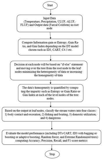 The input parameters and the sample water quality observations come from the input databases, as shown in the decision tree classifier (DTC). The above-discussed decision tree models help classify the water quality data based on input parameters and respective decision tree algorithms. The results are shown in the output database in “water quality predictions/formulae/bounds”. The outputs are put into and as per classes of US EPA water usage classification. From the output classifications, one could figure out the under/over reporting issues, and check for maximum contamination levels (MCLs). In this process, the US EPA data warehouse system will help compare the output water quality parameters with stipulated MCLs. The inner working of any of the above-discussed decision tree classifiers is shown in the flow chart Figure 11.