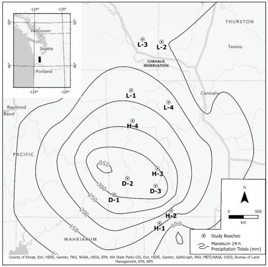 The study area was impacted by a severe storm in 1–4 December 2007 (Figure 1). Peak storm flows of 1724 m3/s at Chehalis River in Doty WA (USGS Hydrologic Unit—17100103) were 2.1 × larger than the next highest flow recorded over the 79-year record at this gauge. The storm produced 20–40 cm of rain over three days. The disturbance agent, heavy rain, was not distributed evenly across the landscape and higher elevation reaches received the most precipitation, which fell on top of a light snowpack. Precipitation totals from the December 1st through 4th storm varied greatly among the sample reach estimates based on three gauges and GIS interpolation of 24 h. maximums (70–90% of total) (Figure 1). All watersheds above the study reaches received more than 100 mm of precipitation during the storm and flooded over bank for more than a day.