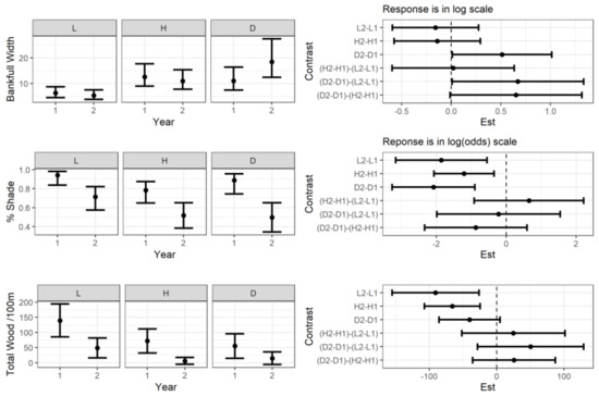 Wet Width—Wet width after the storm had a positive trend in all categories (Figure 5, contrasts 4–6). Mean estimates for D reach wet widths were intermediate to the L and H widths (Figure 5).