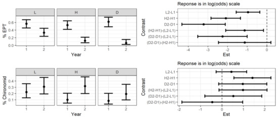 Estimated marginal means with 90% C.I.s of % EPT and % Chironomidae of total abundance before and after 2007 disturbance at low flood (L), high flood (H), and debris flow (D) disturbance categories (left) and contrasts between years (1–3, top) and relative differences in between categories (4–6, bottom) (right).