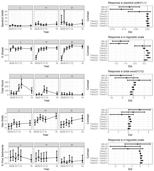 Stream Temperature—Comparison of post-storm maximum temperature among the three disturbance categories showed estimated differences with wide ranges of uncertainty. The difference in expected maximum temperature for H treatments was approximately 1.5 °C higher than L treatments. The estimated ranges overlap (Figure 4). The maximum temperature was estimated to be 18 to 21 °C at L, 20 to 22 °C at H, and 19 to 22 °C at D reaches in 2008. We estimated a mean decrease in temperature trend as H and D reaches, most strongly at D reaches (Figure 4, contrasts 5,6,8,9). An elevated maximum temperature was observed at both L and H reaches for three years (2010–2012) but was not observed at D reaches (Figure 4).