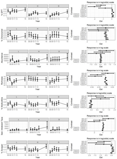 Percent EPT—There was a higher post-storm % EPT in L compared to H and D reaches and some evidence that H reaches were higher than D reaches (Figure 6, contrasts 1–3). The estimates of % EPT were 27 to 41% in L, 8 to 18% in H, and 3 to 11% in D reaches in 2008. There was evidence of a post-storm increase in % EPT for all the disturbance categories, most strongly at D reaches (Figure 6, contrasts 4,5,6,8,9).