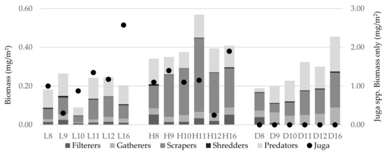 Total biomass (wo/Juga spp.) (mg/m2) for each disturbance category with functional feeding groups contributions in stacked bar following the 2007 storm in 2008–2012 and again in 2016 on first y-axis. On second y-axis biomass of Juga spp. is shown as a circle.