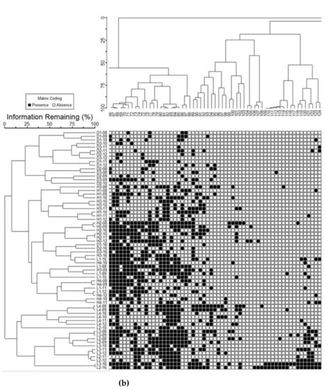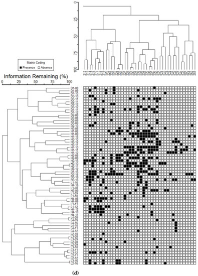 (a–d)Two-way classification by agglomerative clustering of 66 reaches and years by 253 macroinvertebrate species at debris flow (D), high flood (H) and low flood (L) reaches from 2008–2012 and 2016 following a large storm in 2007. X-axis labels—Treatment reach and year (e.g., D1-08, D1-09, etc.). Y-axis label—individual species (1–253) (species information in Table 3). Information Remaining—index of community similarity from 0–100. Macroinvertebrate abundances were transformed to presence and absence for analysis. Wide figure is divided into four parts (a–d), each separated at a major juncture: a—Cluster 1A-species 1–65, b—Cluster 1B species 66–88 and Cluster 2A species 89–124, c—Cluster 2B1 species 125–211, and d—Cluster 2B2 species 212–253 (Table 3).