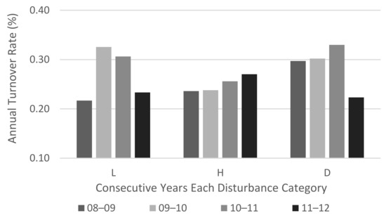 The differences in abiotic and biotic characteristics after the storm starting in 2008 to 2016 are compared in three ways. Differences in abiotic and biotic characteristics post-storm were compared between the disturbance categories after the storm in 2008 (D8–H8, D8–L8, and H8–L8), as well as the average annual change of the response variables for each disturbance category in the eight-year post storm period (TrendD, TrendH, and TrendL). Finally, the linear change of the reach characteristics was compared between the disturbance categories (TrendD–TrendH, TrendD–TrendL, and TrendH–TrendL).