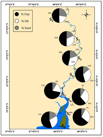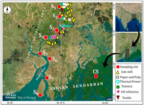 HRE (87°55′01” N to 88°48′04” N; 21°29′02” E to 22°09′00” E), the first deltaic offshoot of the major river Ganges, is a funnel-shaped estuary and covers a catchment area of 6 × 104 km2 perpendicular to the Bay of Bengal, eastern part of India. The river flows in a north–south gradient and the elevation is not more than ~8 m above mean sea level. The tides are semi-diurnal in nature and have tidal amplitude of 3–6 m [13] with the duration of flood tide being approximately 3 h in a 12 h tidal cycle, setting up flood velocities in the range of 2–3 m/s, compared to ebb velocities of <1 m/s [17]. During monsoon, huge quantities of sediment are transported through the rivers and tributaries, a part is deposited in the indentation of terrain and riverbed, while the remaining part is flushed into the Bay of Bengal. In the dry season, sediment is re-oriented, and mainly deposited within the estuary or near the coast. A net accretion rate of about 50.0 million m3/y was observed during the last 175 y in the outer HRE [18]. Eight sampling sites (Tribeni (S1), Barrackpore (S2), Babughat (S3), Budge Budge (S4), Nurpur (S5), Diamond Harbour (S6), Lot 8 (S7), and Gangasagar (S8)), almost equidistant from each other, were selected along the north–south stretches of the HRE (covering ~175 km length) for systematic and rational coverage of the region (Figure 1). For getting a comparative uncontaminated site, a specimen was collected in the Ramsar site at Jyotirampur (CS), situated in the southern part of Indian Sundarban Mangrove Wetland (Bay of Bengal).