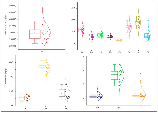 Box and half-violin plot exhibiting concentrations of trace elements. The central bar in the box displays the median value; the end of the whiskers represents the minimum and maximum values. The start and end of the boxes include half the data points between the median and extreme of range.