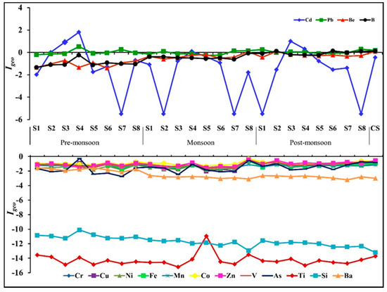 The Igeo was negative (Igeo < 0; Class 0) for all TEs (Cr, Cu, Ni, Fe, Mn, Co, Zn, V, As, Ti, Si and Ba) except for Cd, Pb, Be and B indicating practically unpolluted sediments (Figure 4). At sampling sites Budge Budge (S4) and Babughat (S3) during pre- and post-monsoon respectively, Cd exhibited Class 2 level of contamination (1 < Igeo < 2) while Barrackpore (S2); Babughat (S3) (pre-monsoon), Budge Budge (S4) (monsoon and post-monsoon) were “unpolluted to moderately polluted”. None of the Igeo values was greater than 2.0.The Igeo values of B were less than 0 (Igeo < 0) at all the sampling sites during pre-monsoon and monsoon season while moderate contaminations (0 < Igeo < 1) were recorded at sampling sites Diamond Harbour (S6), Lot 8(S7) and Gangasagar (S8) during post-monsoon. For Pb, Igeo values ranged from 0.53 at Budge Budge (S4) during pre-monsoon to −0.26 at Nurpur (S5) during monsoon season.