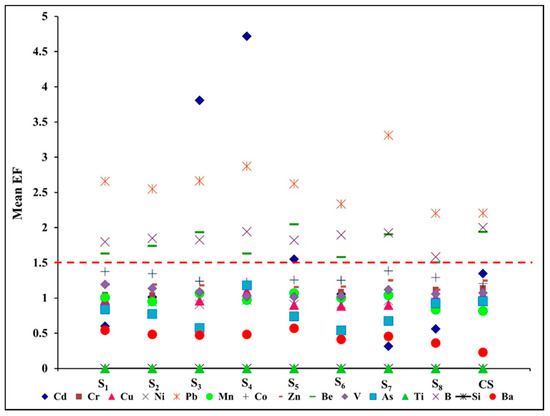 The mean EF values of the TEs in the study area were the follows: Pb (2.63) > B (1.84) > Be (1.76) > Cd (1.69) > Co (1.30) > Zn (1.18) > V (1.08) > Cr (1.07) > Mn (0.99) > Cu (0.97) > Ni (0.94) > As (0.79) > Ba (0.46) > Si (0.001) > Ti (0.0002). As shown in Figure 5, the mean EF values for Cr, Cu, Ni, Mn, Zn, V, Ti, Si, and Ba at all sampling sites were < 1.5, suggesting that TEs were of primarily natural origin. EFs for Pb, Cd, Be, and B exceeded 1.5 indicating the presence of anthropogenic sources in the estuary. Site-specific and sharp inconsistent pattern of EF variations (EF > 1.5) are very much evident revealing the following trend: Pb (all sampling sites), Cd (pre-monsoon: Barrackpore (S2), Babughat (S3), Budge Budge (S4); monsoon: Babughat (S3), Budge Budge (S4), Nurpur (S5); post-monsoon: Babughat (S3), Budge Budge (S4)), Co (monsoon: Barrackpore (S2); post-monsoon: Tribeni (S1)), Be (pre-monsoon: Lot 8 (S7); monsoon: all the sampling sites; post-monsoon: all the sampling sites), As (pre-monsoon: Budge Budge (S4)), B (pre-monsoon: Budge Budge (S4), Lot 8 (S7); monsoon: all the sampling sites except Lot 8 (S7); post-monsoon: all the sampling sites). Igeo and EF values were many-fold higher exclusively for Cd compared to other TEs which was also worked out by previous researchers [12]. Pb, Ni, and Be are present also in the CS with EFs > 1.5 suggesting that they are widespread in the environment affecting also a potentially uncontaminated area (Figure 4, Figure 5 and Figure S2).