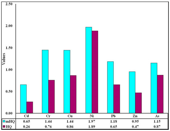 Potential ecological risks: Hazard Quotients (HQ) and modified Hazard Quotients (mHQ) associated with TEs.