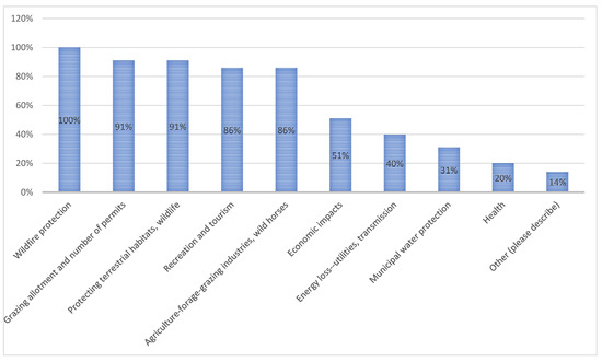 The survey respondents represent different level BLM offices that track and monitor drought well, including 14% from national office, 26% from state offices, and 60% from district/field offices. More specifically, six of the twelve BLM administrative state offices were represented in this survey (i.e., Alaska, California, Colorado, Idaho, Montana-Dakotas, and New Mexico), and 17 district/field offices out of 63 were represented in Arizona/Utah, California, Nevada, New Mexico, Oregon, Utah, Washington, and Wyoming. District/field office regions represented in the survey range from 2500 to over 5 million people served. Administrative state regions represented range from 100,000 to over 5 million people. According to respondents, the most common BLM-related issues that are potentially affected by drought or lack of precipitation include wildfire protection, grazing allotment and number of permits, protecting terrestrial habitats, wildlife, recreation and tourism (such as rafting, kayaks, fishing, aquatic habitats, and hiking), and agriculture-forage-grazing industries and wild horses, as shown in Figure 1. All of the respondents said they work in a role or position that related to the drought issues that they checked. The majority of the survey respondents have a primary disciplinary background of environmental science, GIS, biological science, natural resources science, ecology, or forestry. More than 80% of the survey respondents have more than 11 years’ experience.