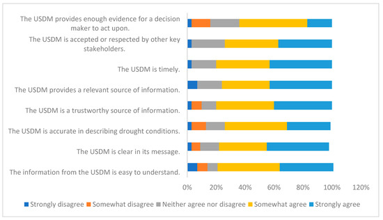 We use Likert scale to understand users’ views and experience with the USDM and the results are shown in Figure 2. Results show that the majority of survey respondents have positive experience and confidence with the USDM. They strongly or somewhat agree on its informativeness, acceptance, timeliness, relevance, trust-worthiness, accuracy, and clarity. There are few negative experience with the USDM, which may due to various reasons such as scale, purposes of tracking or monitoring drought. A follow-up survey may identify these concerns and help improve the USDM. When we asked about the information provided by the U.S. Drought Monitor compared to other sources of drought monitoring information, 93% of the respondents agreed on “the U.S. Drought Monitor provides useful information that I do not get from other sources,” while only one person suggested “the U.S. Drought Monitor provides the same information that I get from other sources.” None of the respondents said that the U.S. Drought Monitor provides less useful information than they get from other sources. The most popular features of the USDM among our respondents are the current and/or archived maps (93%), the text of the drought summary (86%), the links to other tools representing current conditions and outlooks (64%), and the spreadsheets, data, and/or shapefiles (36%). Similar to other climatic and meteorological services, users’ experience and attitude may serve as a baseline for the improvement of products [16]. Due to the fact that familiarity, frequency of using the product, as well as the specific tasks of using the USDM may change over time, it is useful to conduct additional surveys and compare the experience on the USDM with the baseline survey. Despite the caveat, the experience and attitude can also relate to respondents’ value of the USDM.