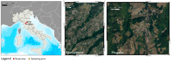 Using regional maps of existing dry-stone walls and LiDAR maps of the Tuscany region, we decided to focus on two areas that were chosen based on their accessibility and distance from our research center: Mugello (Ponzalla, Scaperia e San Piero, Florence–Centroid: 44.021689, 11.367784) and Montalbano (Tigliano, Vinci, Florence–Centroid: 43.804681, 10.930273) (Figure 1).