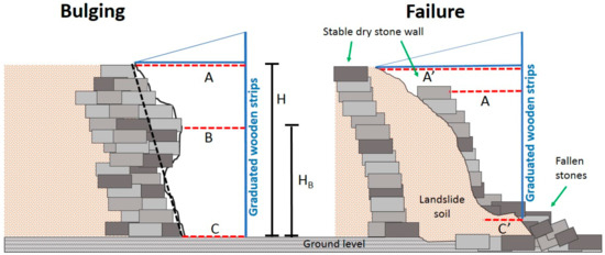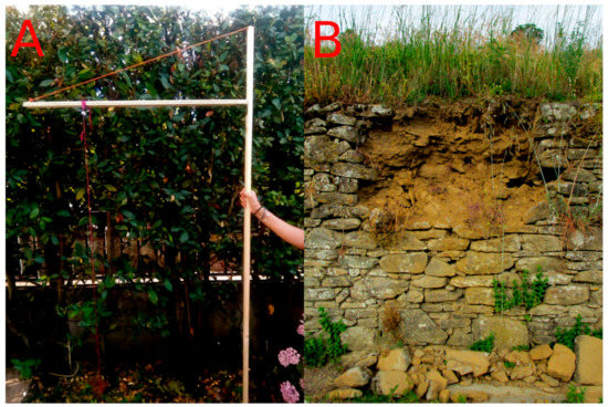 (A) Purpose-built instrument to measure deformation consisting of two graduated wooden strips and a plumb line to carry out horizontal measurements and allow the correct positioning of the instrument. (B) Example of dry-stone wall failure (Mugello area), damage scale 5.
