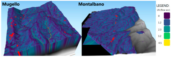 For the two study areas, the available raster grid DTMs can be directly downloaded form the Tuscany Regional Cartographic Portal at: https://www.regione.toscana.it/-/geoscopio. The DTMs were derived from LiDAR survey (airborne laser scanner–ALS) in 2008 with a resolution of 1 m × 1 m. The high sampling density provides reliable estimates in relation to the DTM processing techniques and any estimation errors [50]. The raster DTMs were processed to obtain two raster grids, useful to model water movement on the slopes; namely, flow accumulation and water discharge.