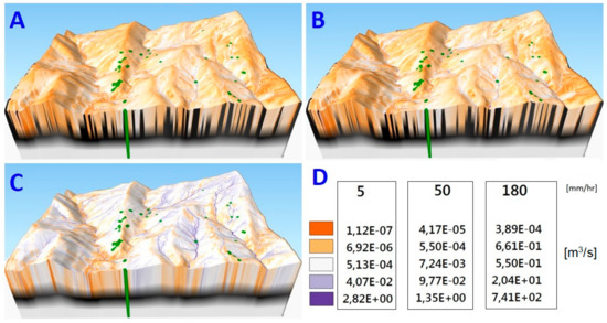 Water discharge maps for simulations with precipitation values of (A) 5 mm/h, (B) 50 mm/h, and (C) 180 mm/h. (D) Legend of the water discharge for each simulation. Values in scientific notation for high variability. Map Scale 1:10,000.