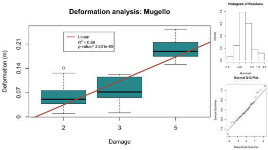 Relationship between the subjective damage scale (Table 1) and the in situ deformation measurements (Df or Db) of the dry-stone walls in the Mugello region. The graphs on the right show the histogram and Q-Q plot of the residuals of the regression model—Boxplot: Box = 1.5 × IQR, Q1, Q2, Q3; Whiskers = Min and Max.