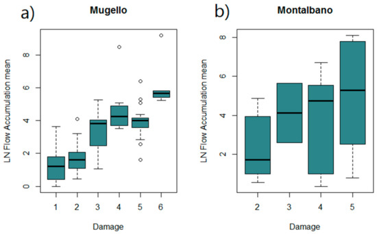The damage class was then compared with the average flow accumulation values, as mentioned, both individually for the Mugello (Figure 7a) and Montalbano areas (Figure 7b) and for the combined dataset (Figure 8).