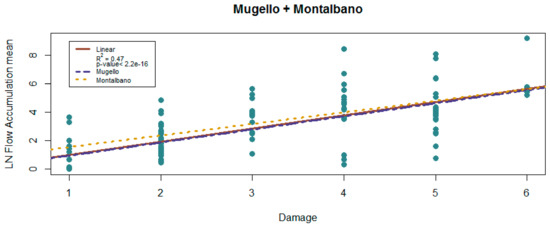 In both study areas we found a statistically significant correlation between the damage classes and the flow accumulation values (Mugello R2 = 0.57, p < 0.001; Montalbano R2 = 0.14, p < 0.01). In Mugello, the statistical significance of the correlation was higher than in Montalbano because of the higher variability in the Montalbano flow accumulation data (Montalbano = 19% Mugello, in sample points terms). If we plot the median flow accumulation against the damage class, the correlation is even higher (R2 = 0.88, p < 0.005, Figure 9).