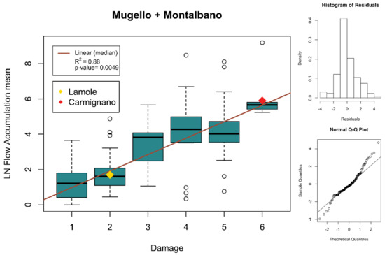 Box plot of the combined dataset and the addition of two values obtained from the Lamole and Carmignano regions (Tuscany, central Italy) [17]. The ordinate now shows the median of the flow accumulation. The graphs on the right show the histogram and Q-Q-plot of the residuals of the regression model—Boxplot: Box = 1.5 × IQR, Q1, Q2, Q3; Whiskers = Min and Max.