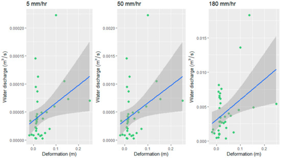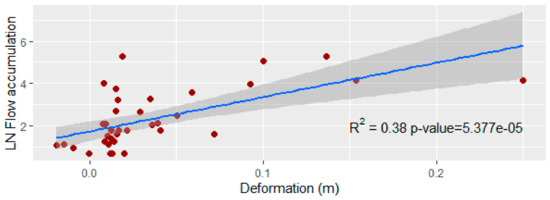 We also found a statistically significant, albeit lower correlation between the measured deformation and the average flow accumulation (R2 = 0.38, p < 0.001, Figure 10).