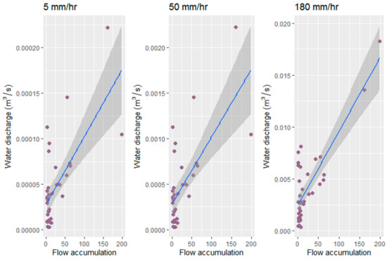 Scatter plots and linear regression for water discharge versus flow accumulation for three precipitation intensities. See Table 3 for the correlation coefficients. While in 5–50 mm/h simulation water discharge has similar increase of intensity (10 times), in 50–180 mm/h comparison, water discharge shows a reduction of dispersion.