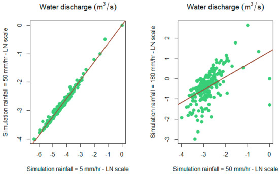 To further investigate the effect of different rainfall intensities on water discharge, we extracted the water discharge from 200 randomly selected locations in our model domain for the three rainfall intensities. The random points were obtained using a QGIS tool, contained in the GDAL library. The water discharge value increases with rainfall intensity, increasing from 5 mm/h to 50 mm/h, and showing a good (perfect) correlation (Figure 12). As the rainfall intensity increases further to 180 mm/h is always increasing, but not well correlated (Figure 12).