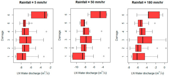 Box plots comparing water discharge and wall damage (using the subjective damage classification scale) for the three precipitation scenarios—Boxplot: Box = 1.5 × IQR, Q1, Q2, Q3; Whiskers = Min and Max.
