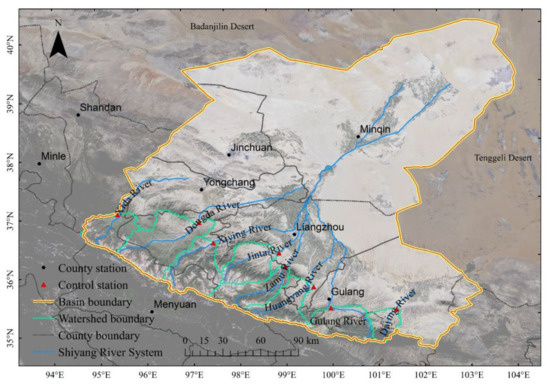 The Shiyang River Basin is located in the east part of the Hexi Corridor in Gansu Province in northwest China [19]. It is on the west of the Wushaoling Mountains and north of the Qilian Mountains at longitude of 100°57′–104°12′ E and latitude of 37°02′–39°17′ N, occupying an area of 41,600 km2 (Figure 1). The administrative divisions of the watershed include the four prefecture-level cities of Jinchang, Wuwei, Zhangye, and Baiyin, and nine counties of Liangzhou, Gulang, Minqin, Tianzhu, Yongchang, Jinchuan, Sunan, Shandan, and Jintai. The Shiyang River Basin is one of the three inland river basins of the Hexi Corridor, and the headwater rivers from east to west are the Dajing, Gulang, Huangyang, Zamu, Jinta, Xiying, Dongda, and Xida Rivers. The flow characteristics of the river and the control station information are shown in Table 1. The sources of river supply are atmospheric precipitation in mountainous areas and melting snow and ice in the high mountains. The mean annual runoff is 1.50 billion m3.