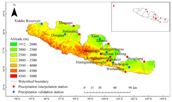 where P is monthly precipitation (mm); xa is albers projection x coordinate; ya is albers projection y coordinate; z is altitude; and a, b, c, d, e, f, g are regression parameters. We used data from 12 meteorological stations (Figure 2) of the China Meteorological Administration to calculate precipitation from 1961 to 2016 in the study basin. There are ten precipitation stations (Shagousi, Jiutiaoling, Maozangsi, Huangniangniangtai, Zamusi, Kongjiazhuang, Shajintai, Wushaoling, Gulang, and Hengliang) within the Shiyang River Basin. The altitude of these stations ranges from 2010 to 3045 m. Because there is no precipitation station in the high-altitude area of the Shiyang River Basin, two sites (Hulu-1, Hulu-6) in the Hulugou watershed were added as supplements, 110 km west of the Shiyang River Basin. The altitudes of these two sites are 2980 and 4484 m, respectively. The precipitation data from six stations (Xidahe Reservoir, Dongtan, Xiasi, Shanggechagou, Motaizi and Toudaogou, in Figure 2) were used for validation.