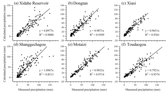 Comparison of calculated and measured values of precipitation stations in the Shiyang River Basin.