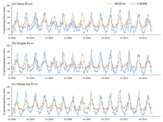 Figure 4 presents the change curve of CBHM calculated monthly ET and MOD16/ET monthly product data of three rivers in the Shiyang River Basin from 2000 to 2015. The simulated evapotranspiration in three watersheds is basically consistent with the change trend of remote sensing data results. Closer inspection of the figure shows the model calculated ET is generally higher than the remote sensing value in the summer. On the contrary, the CBHM results are lower than the MOD16/ET data in the winter.