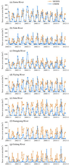 In the CBHM, the snow cover area is the monthly snowfall area. We used Moderate Resolution Imaging Spectroradiometer (MODIS) snow cover product to verify the simulation results. The product name is MODIS Snow Cover Monthly L3 Global 0.05 Deg CMG, and it is a dataset that reports monthly average snow cover, in 0.05 degree (approximately 5 km) resolution climate modeling grid (CMG) cells. Monthly averages for each CMG cell are calculated from the corresponding 28–31 days of observations in the MOD10C1 daily maximum snow cover extent dataset.