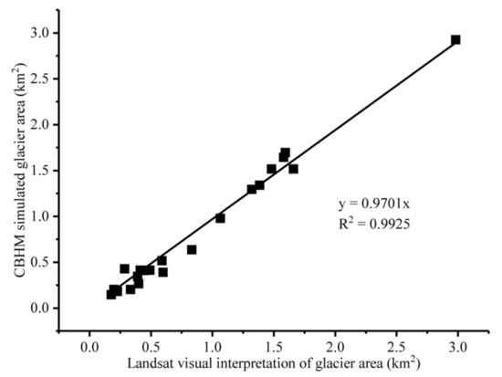 This is the most recent version of these data to test the simulation results of the glacier model. We used glacier area as analytical content (Figure 6). The glacier area, simulated by the model, fits well with the visual interpretation results of remote sensing images (R2 = 0.993).