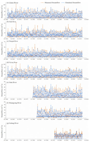 Figure 7 shows the CBHM-simulated monthly streamflows at seven watersheds of the Shiyang River Basin as compared with the observed data.