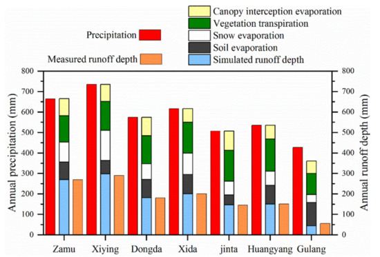 The bar chart below (Figure 8) shows the average annual water balance in the simulation period of seven watersheds in the Shiyang River Basin. Except for the Gulang River Basin, the annual precipitation, total evaporation, and the runoff of the other six river basins, meet the water balance. The simulated and measured annual average runoff depth is almost the same.