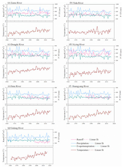 To analyze the impact of climate change in the Shiyang River Basin on mountain runoff, we calculated the average annual temperature, precipitation, ET, and annual average runoff of each small catchment (Figure 9) and a linear fitting was performed. From the graphs, we can see that the monthly average temperature in the Shiyang River runoff generation area has increased significantly since 1961. Except for the Gulang River Basin, the average annual precipitation in the other six basins has decreased, and annual evapotranspiration showed a downward trend. The annual runoff of each river basin had no obvious increase or decrease trend from 1961 to 2016.