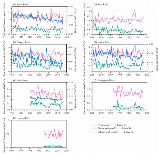 The annual average runoff of the Shiyang River Basin showed alternating changes between high and low levels and did not decrease significantly from 1961 to 2016. In the Zamu River, Dongda River, and Xida River Basins, the annual snowmelt runoff showed a significant decreasing trend from 1961 to 2016. The annual average glacial meltwater in the Shiyang River Basin showed a downward trend from 1961 to 2016, and it has decreased significantly (p < 0.05) since 1998. In 1981 and 1998, there were two peaks of glacial meltwater.