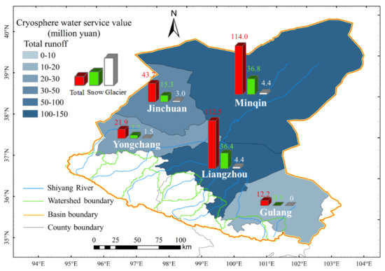With the global warming trend, the variance of mountainous runoff imposes the direct and decisive impact on the downstream zone socioeconomic development and ecological environment shield. We got the annual cryosphere water resources through the model. To evaluate the service value of cryosphere water resources in the Shiyang River Basin, we used the 2016 Shiyang River Basin cryosphere water resources as input. Then, we combined the economic data of the counties in the Shiyang River Basin. Finally, through the calculation of the cryosphere water resources service evaluation model, we assessed the current value of cryosphere water resources services in the Shiyang River Basin. Figure 11 clearly shows the service value of cryosphere water resources in each county of the Shiyang River Basin. In addition, the service value of snowmelt water and glacier meltwater service values are displayed in the form of a bar graph in each county. Cryosphere water resources services show a higher value in Liangzhou and Minqin. Cryosphere water resources service has the lowest service value in Gulang County, and there is no glacier meltwater service. The service value of cryosphere water resources in the entire basin is 304.2 million yuan, in which the service value of snowmelt water is 96.8 and the service value of glacier meltwater is 13.4, and their respective proportions are 31.8% and 4.4%.