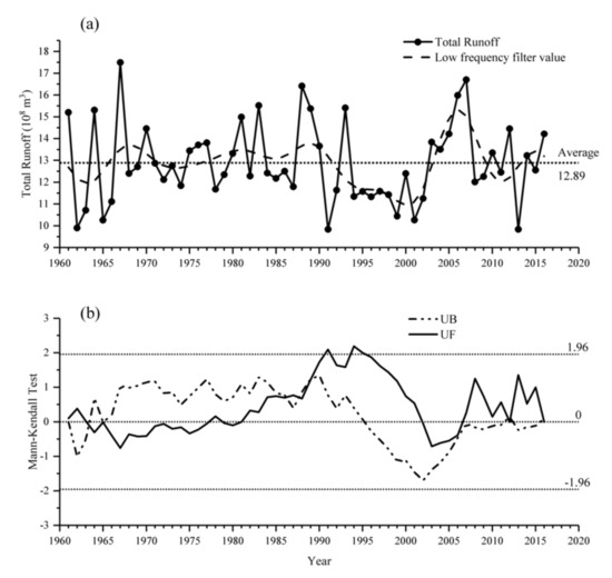 Changes in the total runoff of the seven catchments of the Shiyang River Basin from 1961 to 2016. (a) Total Runoff (108 m3), (b) Mann-Kendall Test.