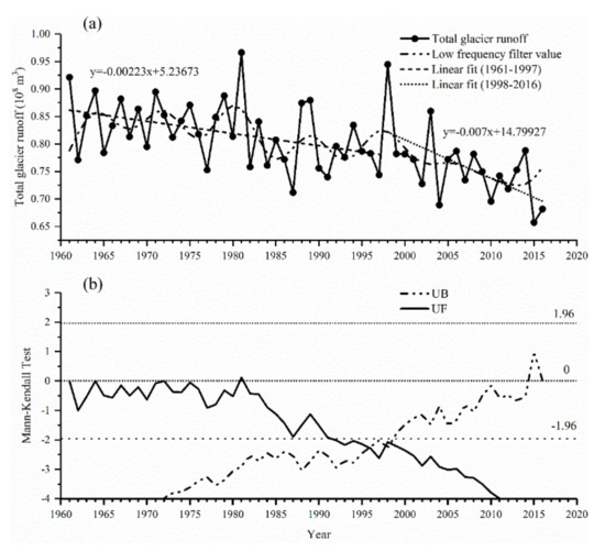 Annual variation of glacial meltwater runoff in the Shiyang River Basin from 1961 to 2016. (a) Total glacier runoff (108 m3), (b) Mann-Kendall Test.