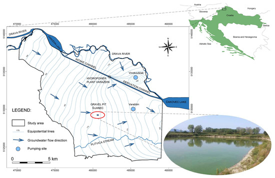 The study area, situated in the Drava River valley, upstream of the town of Varaždin (NW Croatia), belongs to the Black sea catchment and covers an area of approximately 200 km2 (Figure 1). On the NW side, the alluvial aquifer is adjoined by the Varaždin Lake, an artificial reservoir of the hydroelectric power plant Varaždin, of which the Drava River watercourse constitutes a natural border in the NE direction. The Plitvica Stream flows at the S-SE edge of the study area, while in the middle there are several active and inactive gravel pits. All gravel pits represent exposed groundwater and vulnerable areas where the contamination of groundwater can occur faster from surface contaminants. In some cases, inactive (abandoned) gravel pits are used as waste (industrial or urban) disposal sites and are becoming a threat to groundwater quality [37,38,39].
