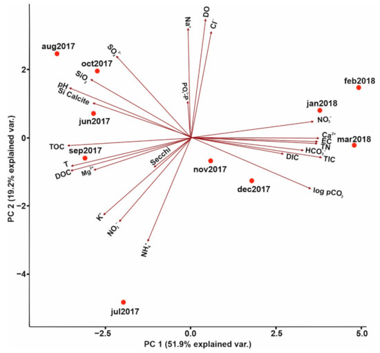 The principal component analysis (PCA) performed for the 24 environmental variables explained 71.1% of the total variance on the first two PC axes. The overall strength of correlations between the samples and environmental parameters are summarized in Table 2. The most important variables for the PC1 axis were TIC, Ca2+, and EC (intra-set correlations: 0.271, 0.269, and 0.268, respectively). Regarding the PC2 axis, NH4+ and DO (intra-set correlations: −0.355 and 0.407, respectively) were the variables that weighted most for the ordination. PCA arranged the samples into three groups (Figure 2): the first group consisted of samples from a warmer period of investigation (June, August, September, and October), the second group included a sample from July, while the third one comprised all samples from the colder period of investigation (November, December, January, February, and March).